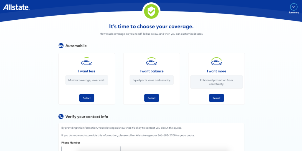 Finally, you’ll be invited to choose your level of coverage. From here, Allstate will be able to send you a customized quote.